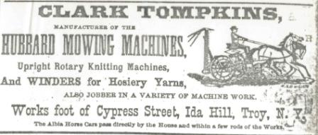 One of Clark Tompkins’ earliest and most successful inventions was the Upright Rotary Knitting Machine, patented with the help of gifted inventor John Johnson of Troy, with whom he collaborated on a number of knitting machine improvements. The City of Troy and its vicinity claims that the machine was “not surpassed by any other contrivance of its kind in its simplicity of construction and its adaptation to perfect the work for which it was so skillfully designed.”
