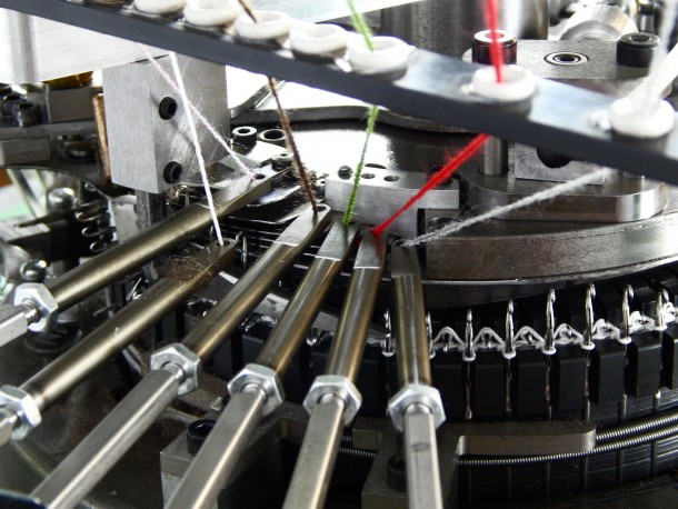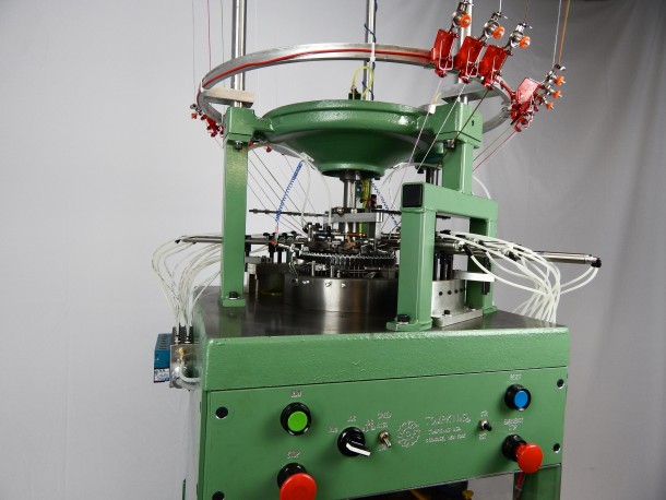 Retaining many of the key features of the Model R, the Model SR also allows for ribbed striping of up to 6 colors and/or knitted materials. With advanced electronics, the Model SR allows you to control both striping and contouring to meet your needs. Available in a 7” diameter, the Model SR is used extensively for the production of hockey socks, knit caps, and protective clothing hybrids. Lycra feed capability available for improved product quality.