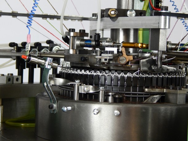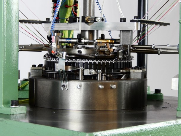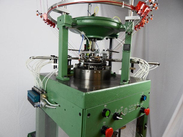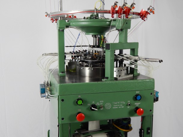 Retaining many of the key features of the Model R, the Model SR also allows for ribbed striping of up to 6 colors and/or knitted materials. With advanced electronics, the Model SR allows you to control both striping and contouring to meet your needs. Available in a 7” diameter, the Model SR is used extensively for the production of hockey socks, knit caps, and protective clothing hybrids. Lycra feed capability available for improved product quality.